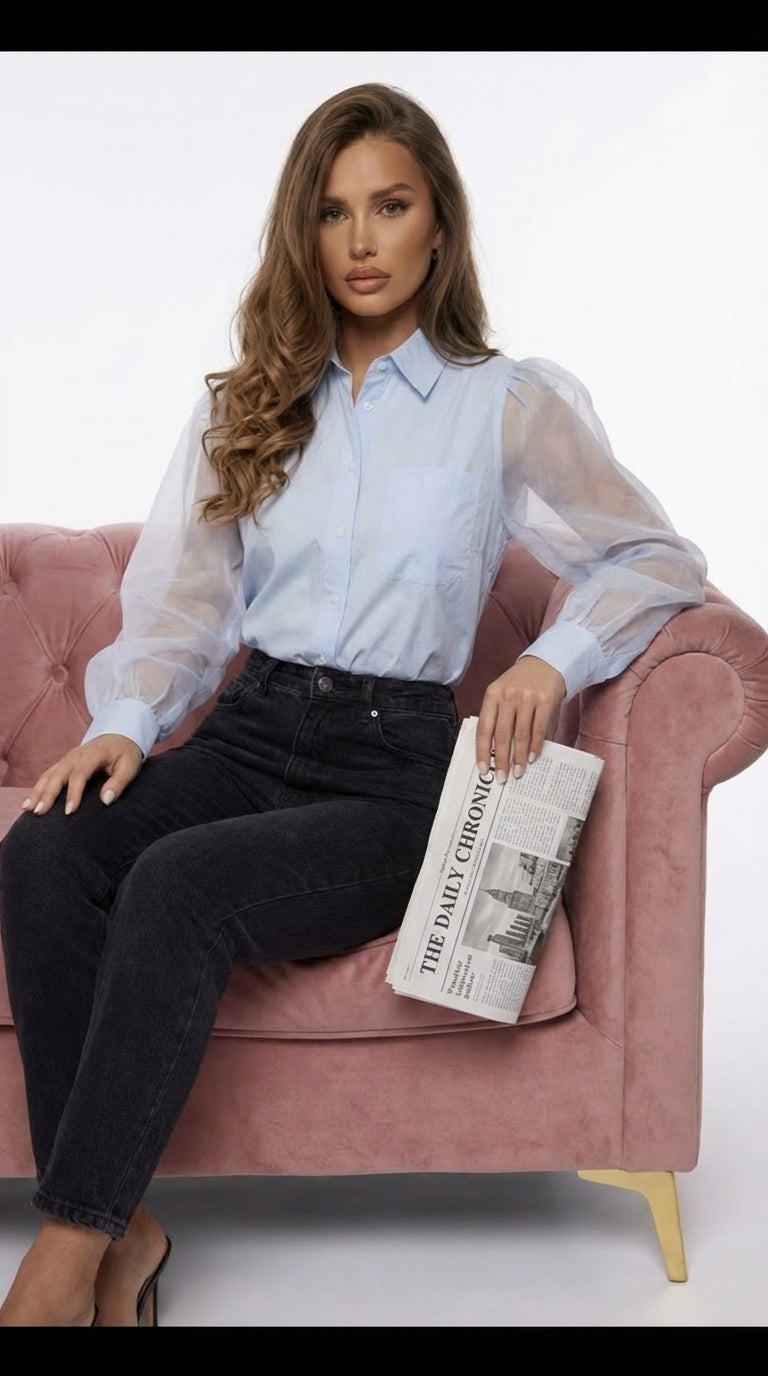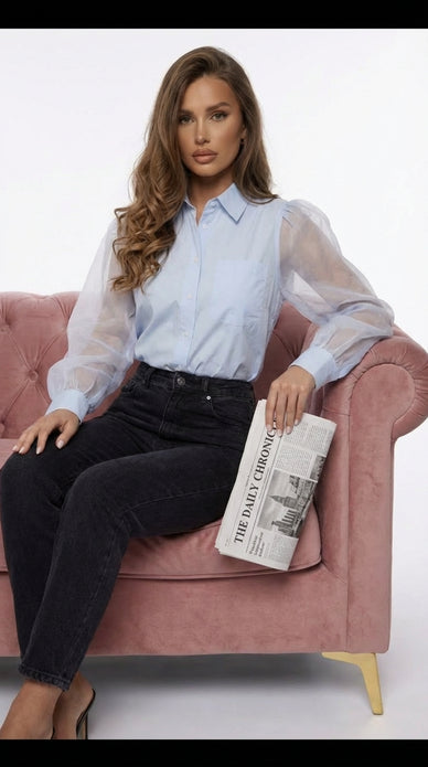 Le corps en coton apporte tenue et confort, tandis que les manches transparentes dévoilent la peau avec subtilité, sans jamais tomber dans l’excès. Une chemise qui suggère plus qu’elle ne montre, et qui affirme une féminité maîtrisée, élégante et moderne.